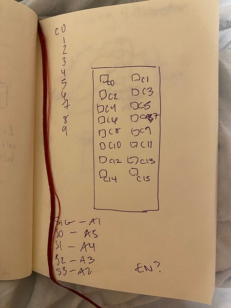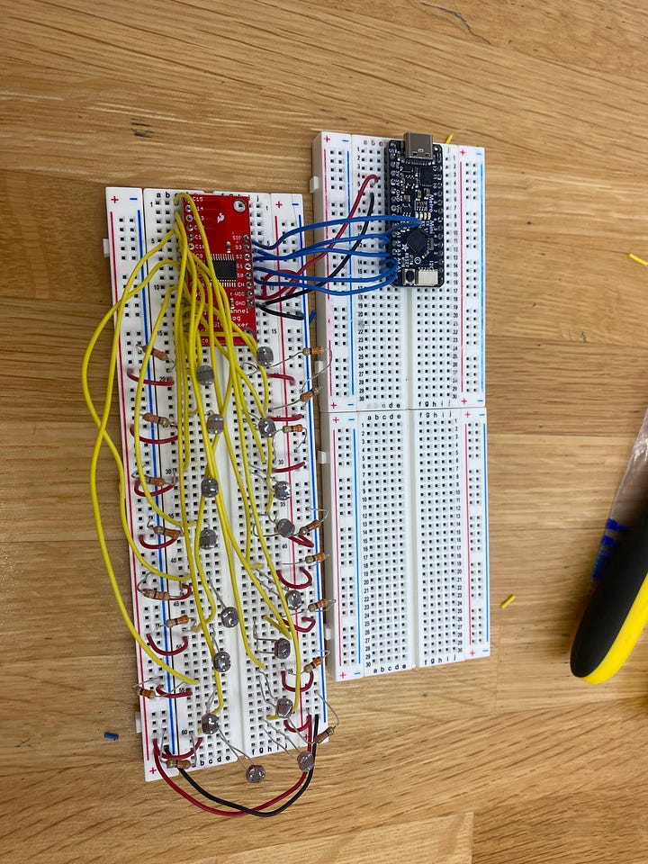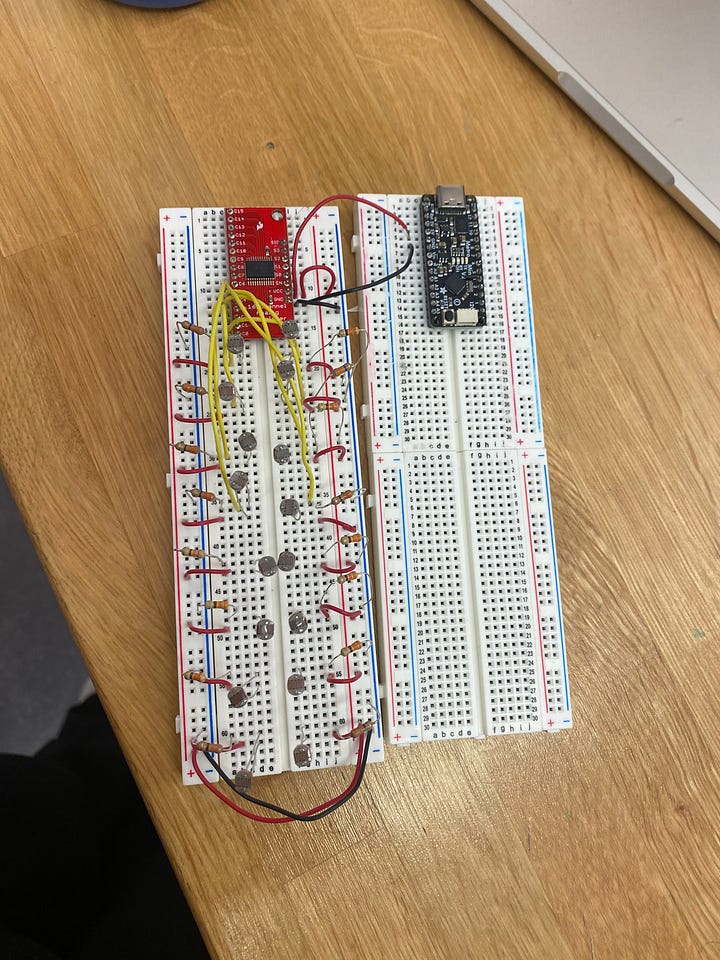This week, I did a lot of work on the basic setup and planning of my project. I am almost done with the woven portion of the piece and will finish that by the end of the week. I also wired up all my photocells to the multiplexer (which is a bit of a wire soup). I am a bit unsure of how the out pins of the multiplexer work (s0,s1,s2, sig, etc.) and I’m not sure which pins I actually need to use yet. The library does not provide very good info so I’ll have to do some more research. I began coding and setting up my pins/pin modes, and will be able to work on some of the code over the break.